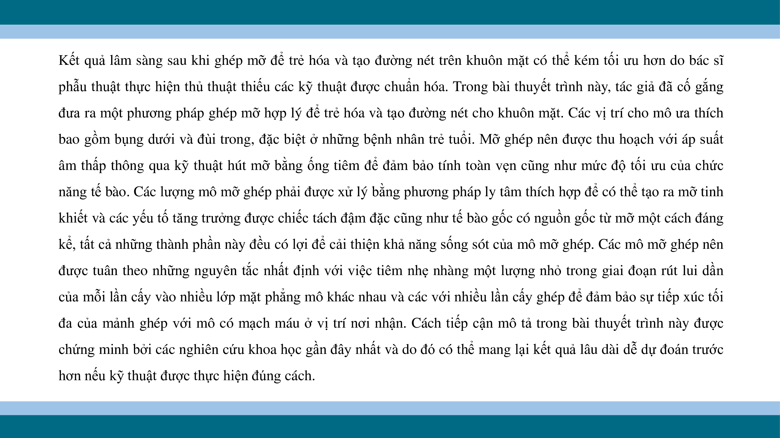 Đến với Hội nghị Khoa học PARS 2024, Giáo sư Lee L.Q. Pu mang đến 5 bài báo cáo. Bài báo cáo thứ 2 có chủ đề "Cấy mỡ để trẻ hóa và tạo đường nét cho khuôn mặt"