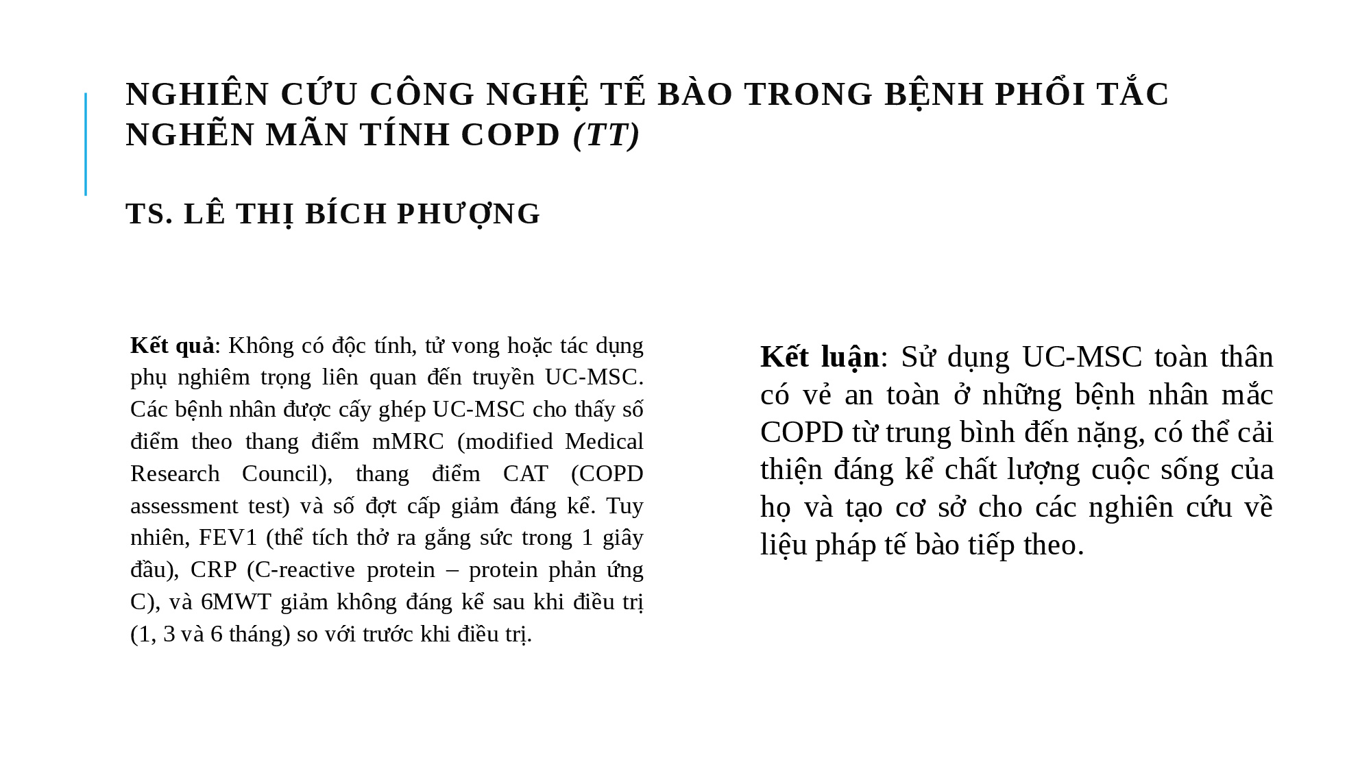 Ghép tế bào gốc trung mô nguồn gốc từ dây rốn đồng loại để điều trị bệnh phổi tắc nghẽn mãn tính: một nghiên cứu lâm sàng thí điểm - TS.BS Lê Thị Bích