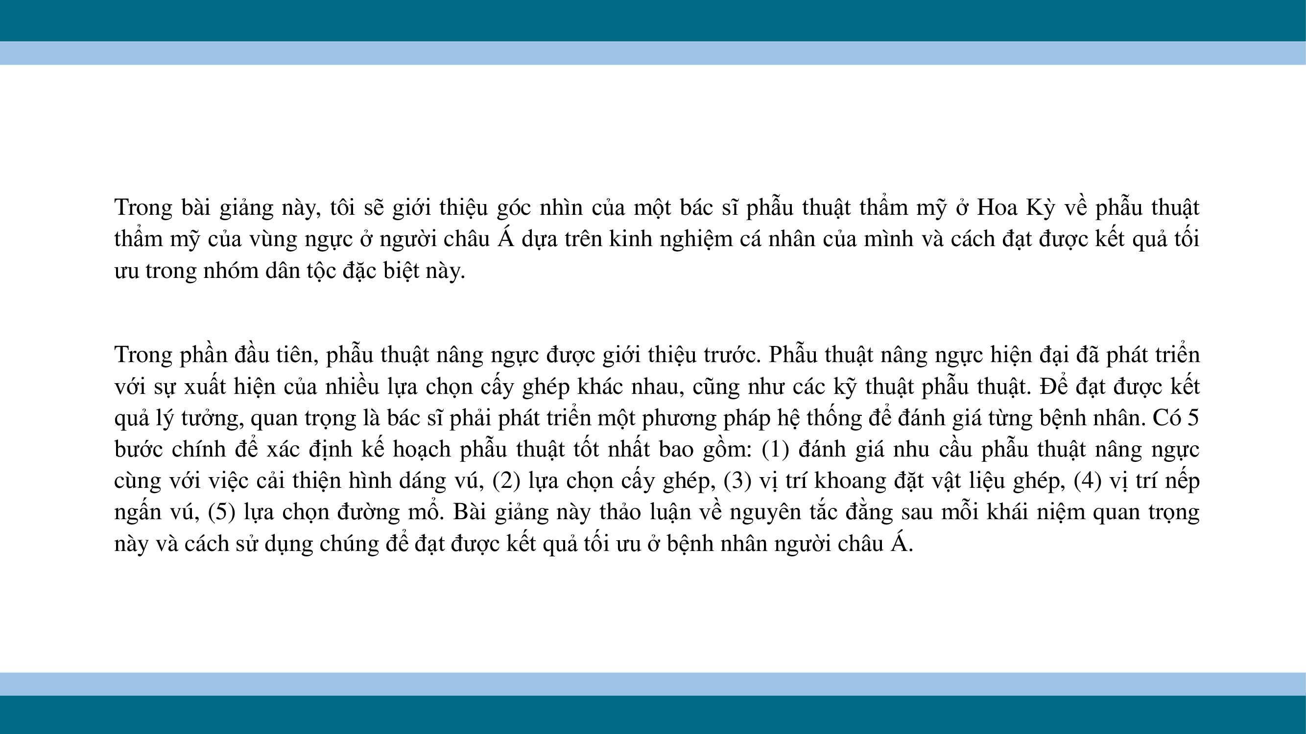 Phẫu thuật tạo hình và thẩm mỹ vùng ngực ở người châu Á: Góc nhìn của một bác sĩ phẫu thuật thẩm mỹ ở Hoa Kỳ - Giáo sư Lee L.Q. Pu