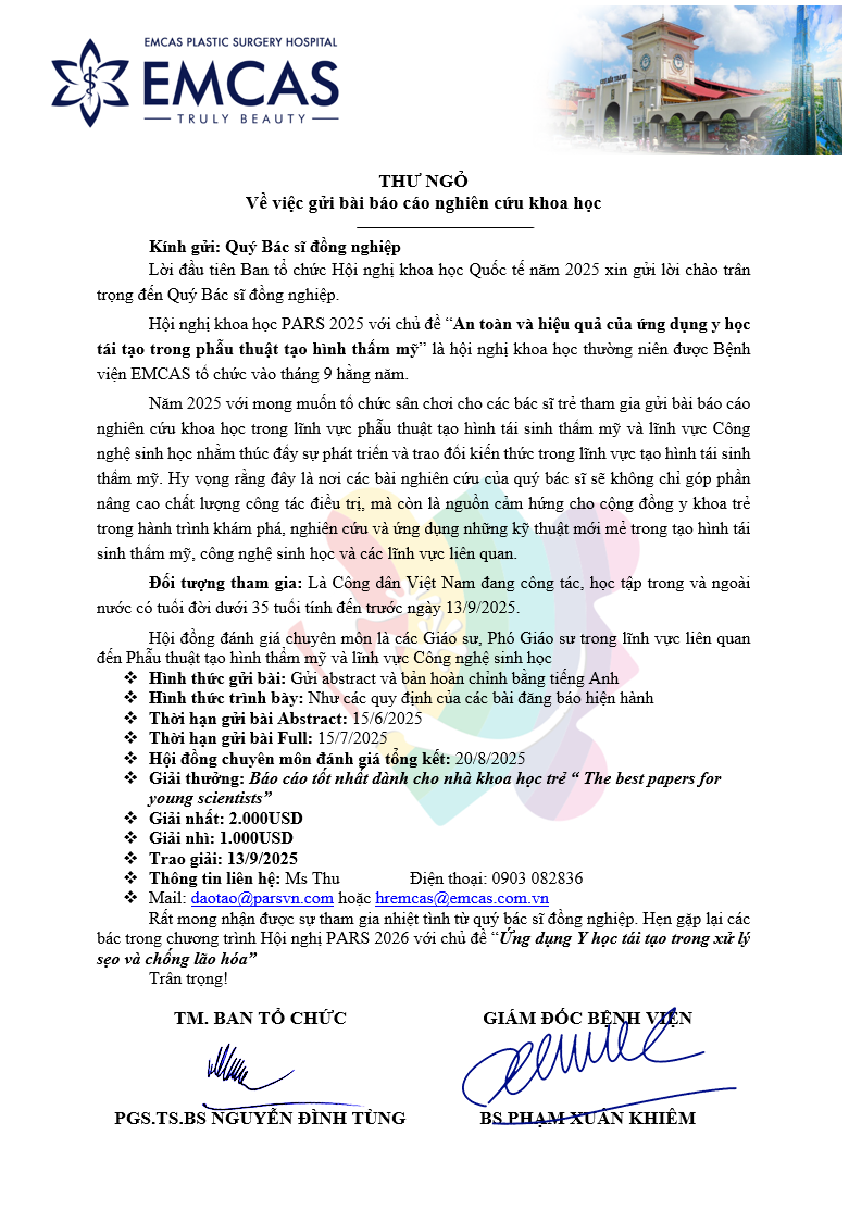 Hội nghị khoa học PARS 2025 với chủ đề “An toàn và hiệu quả của ứng dụng y học tái tạo trong phẫu thuật tạo hình thẩm mỹ” là hội nghị khoa học thường niên được Bệnh viện EMCAS tổ chức vào tháng 9 hằng năm.