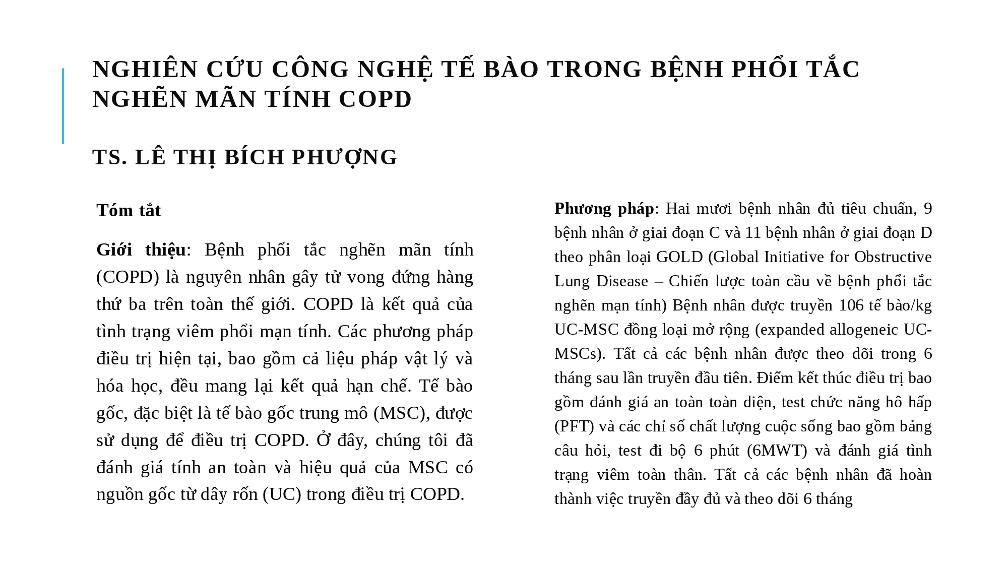 Ghép tế bào gốc trung mô nguồn gốc từ dây rốn đồng loại để điều trị bệnh phổi tắc nghẽn mãn tính: một nghiên cứu lâm sàng thí điểm - TS.BS Lê Thị Bích