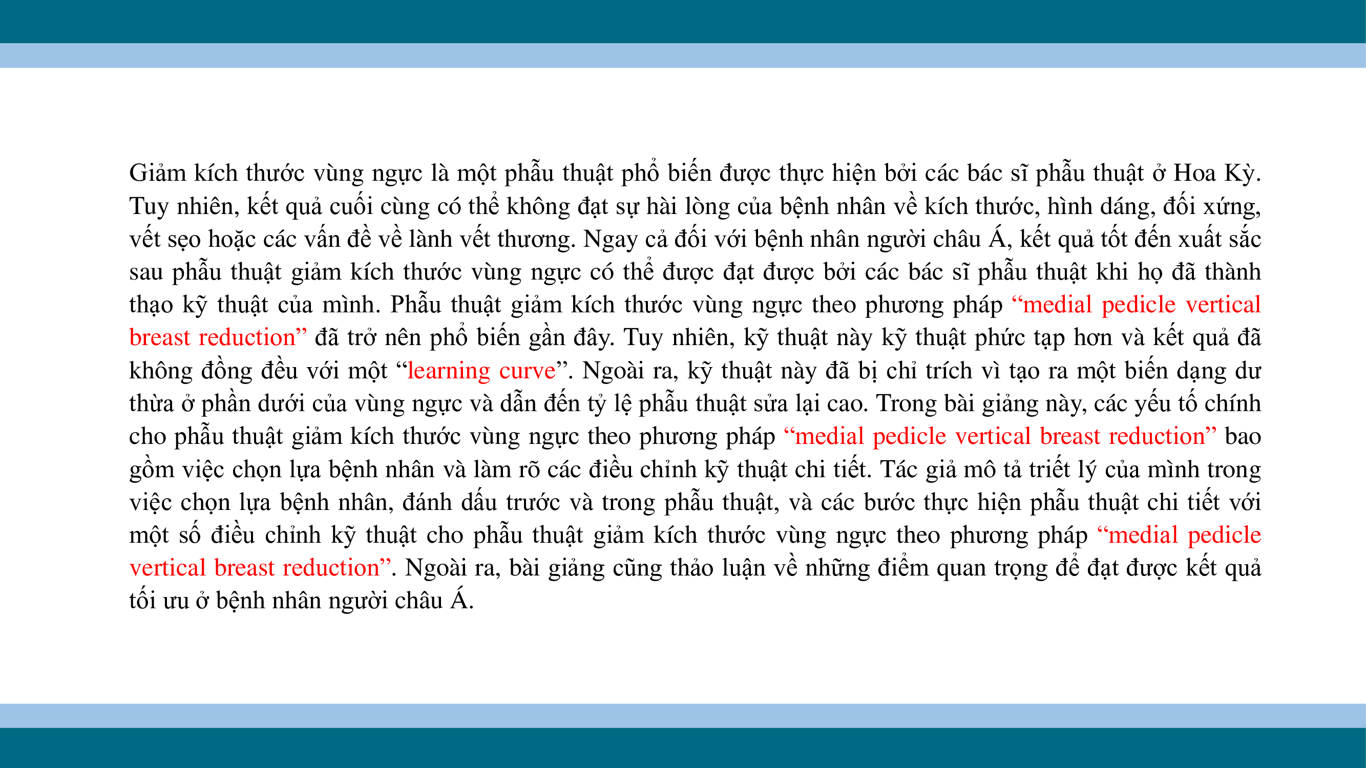 Phẫu thuật tạo hình và thẩm mỹ vùng ngực ở người châu Á: Góc nhìn của một bác sĩ phẫu thuật thẩm mỹ ở Hoa Kỳ - Giáo sư Lee L.Q. Pu